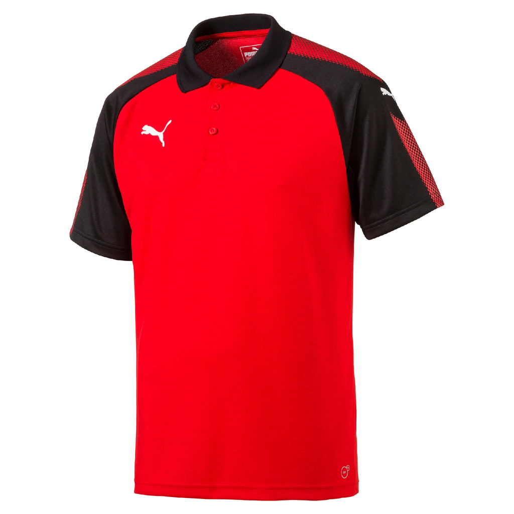 PUMA Cat heat transfer branding to chest. Dynamic PUMA Formstrip graphic pigment print to sleeves. 3 button placket. Circular knit, double knit honeycomb shell for comfort and performance. Dry Cell moisture management.